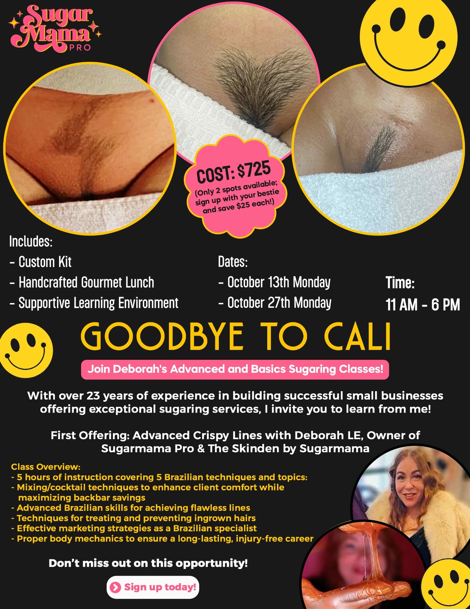 Deborah is saying goodbye to Cali and will be holding a few ADVANCED CLASSES as well as BASICS of Sugaring. I pour my heart as well as 23+ years of experience building small businesses while offering exceptional sugaring services. Let me teach you.